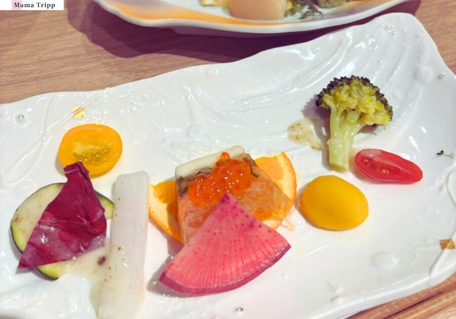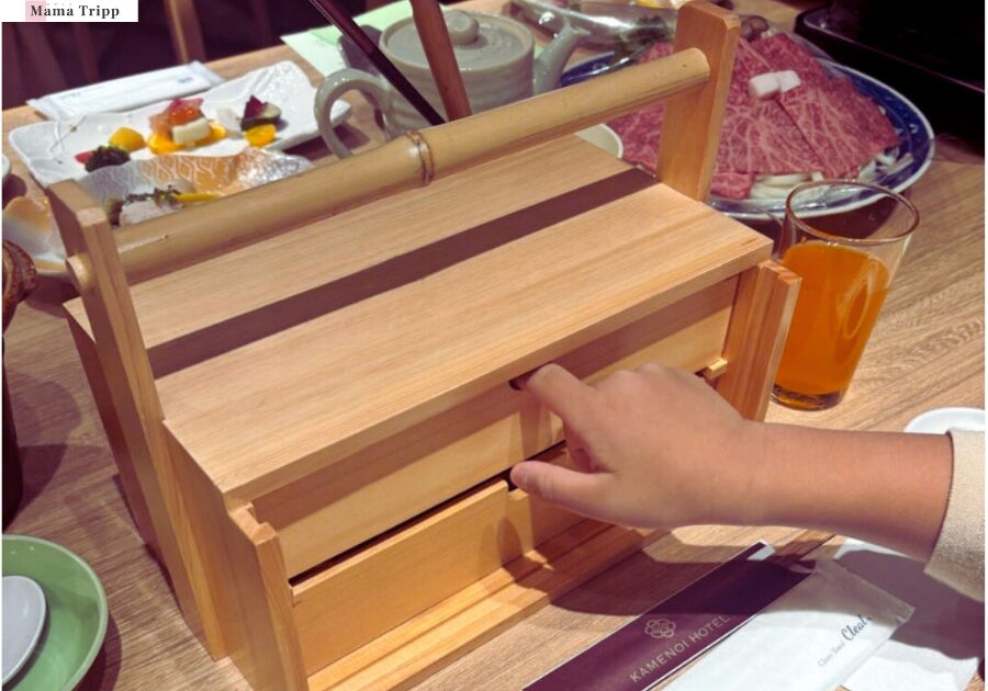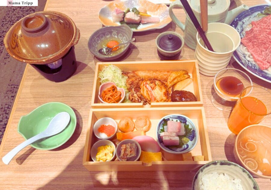 子ども向けには未就学児用と小学生用のキッズメニューが用意されており、小学生用は玉手箱のような見た目のお重に、お刺身・揚げ物・ハンバーグ・いくらまで詰まった豪華な内容。味噌汁やうどんも付いて、かなりのボリュームです。見た目のインパクトで子どものテンションも上がりました。