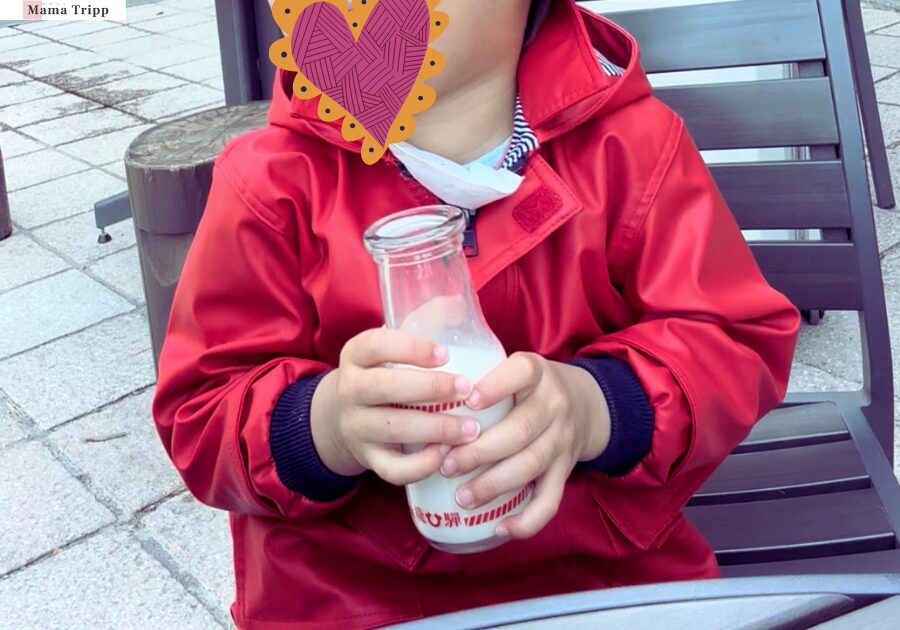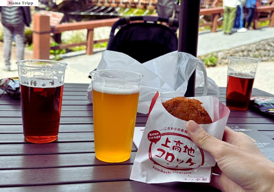 河童橋のたもと、五千尺ホテル側にある売店でひと休み。パパと私は「松本ブルワリー」の樽生クラフトビール(¥900税込)を、子どもは地元の牛乳で乾杯しました。ベンチに腰かけて、穂高連峰を眺めながら飲む一杯は、歩いた後のごほうびそのもの。