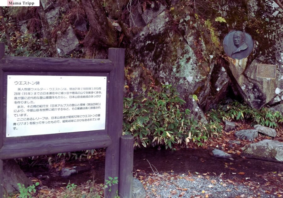 田代橋の近くに立つ「ウエストン碑」は、日本に近代登山を広めた英国人宣教師・ウォルター・ウェストンの功績をたたえる記念碑です。梓川と穂高連峰を背景にしたウェストン園地にあり、散歩の途中の記念撮影スポットとしても人気です。