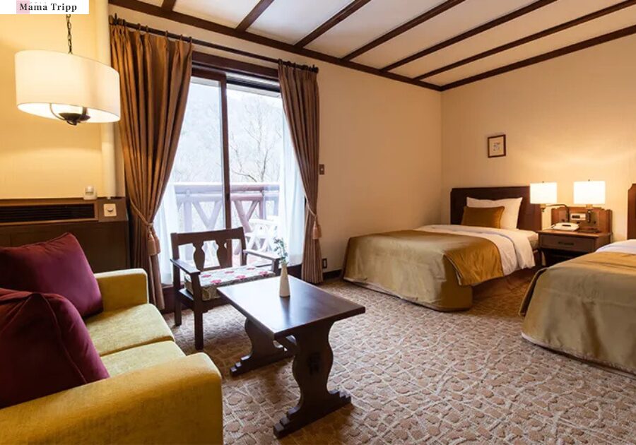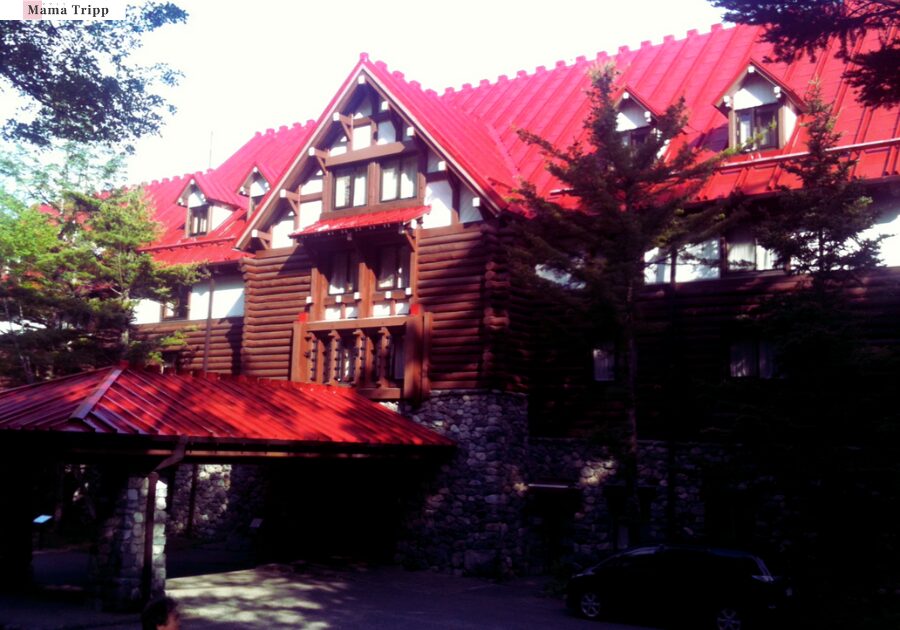 1933年に日本初の本格的山岳リゾートとして開業し、赤い三角屋根と丸太小屋風の外観、吹き抜けロビーの大きなマントルピースが象徴です。