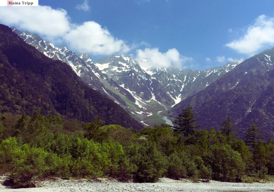 穂高の稜線を眺めながら、梓川の遊歩道をたどって河童橋まで。フラットな遊歩道は、子どもと一緒のお散歩にもちょうどいい距離感です。