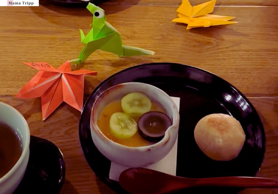 テーブルには色とりどりの折り紙(カエルや紅葉の葉っぱ)がちょこんと。実はこれ、和食の料理長さんが趣味で折った手作りとのこと。息子は「見て見て!」と夢中で遊び、待ち時間もにこにこ。温かいお茶と甘味、そして折り紙のおかげで、親子そろってほっと一息つけました。