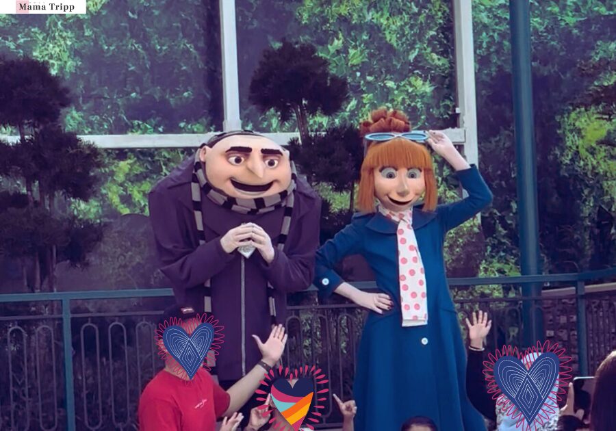 朝一番に出会えたのは、なんとグルーとルーシー!まだゲストが少なかったこともあり、ほとんど並ばずにスムーズに写真を撮ることができました。キャラクターグリーティングは1日に数回行われ、時間と場所が決まっています。当日パークに入ったら、ぜひ公式アプリや園内の案内ボードをチェックしてみてください。