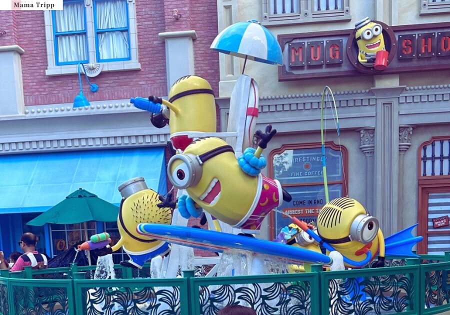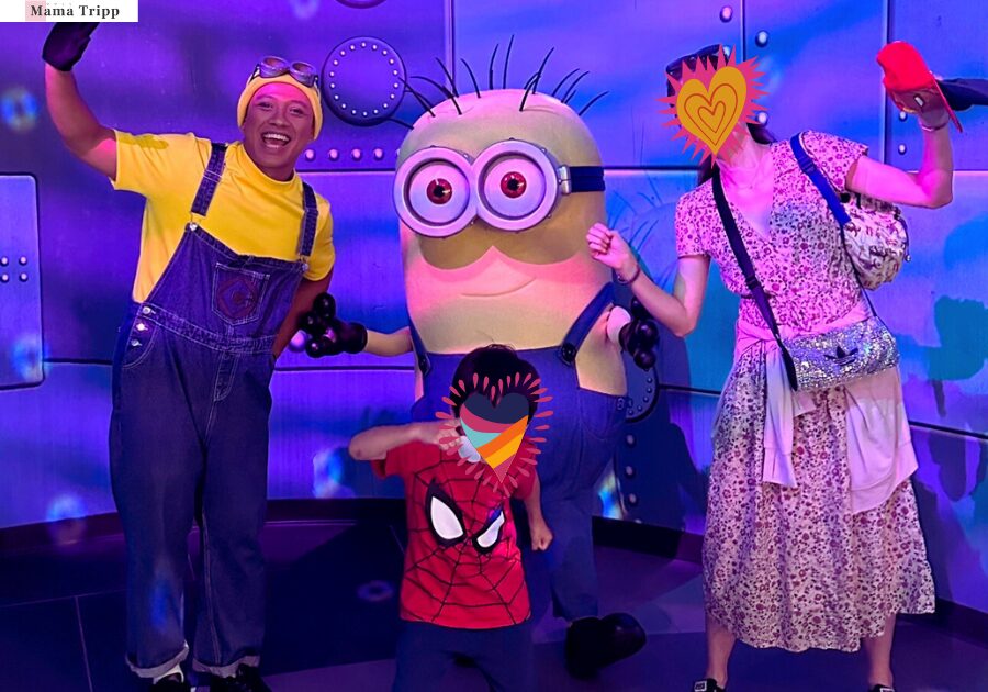お土産ショップの前で突然音楽が鳴り響き、ミニオンたちがノリノリでダンスを開始!買い物どころではなくなり、子どもは夢中でステップ、ママは慌ててカメラを構える…そんなサプライズに大笑いでした。